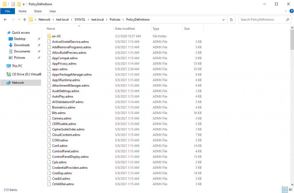 Inside it, .admx files and language directories (for example, en-US) containing .adml files should be placed.